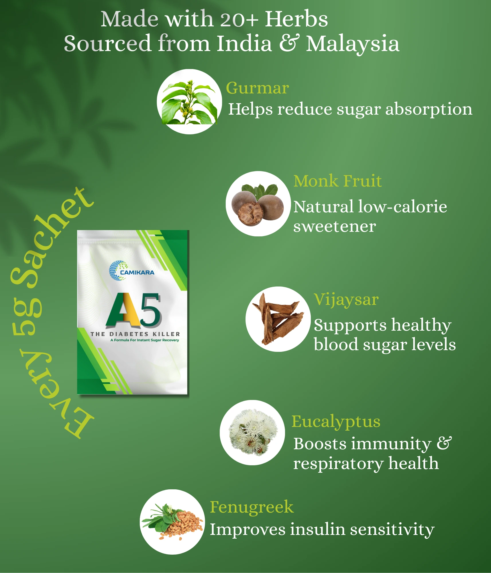 A5 isn’t just a supplement — it’s the best Ayurvedic supplement for diabetes, trusted by thousands. It’s a complete herbal kit designed to reverse diabetes naturally within 3 months. Formulated with 20+ powerful herbs from India and Malaysia, A5 works with your body to restore natural insulin function, balance blood sugar levels, and boost energy — all without side effects.
